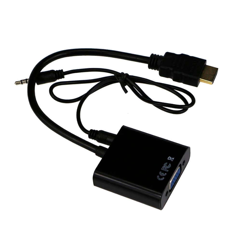 - Conversor HDMI a SVGA y audio con conector HDMI macho en un extremo y conector D-sub HDB15 hembra y Jack 3.5 hembra en el otro.