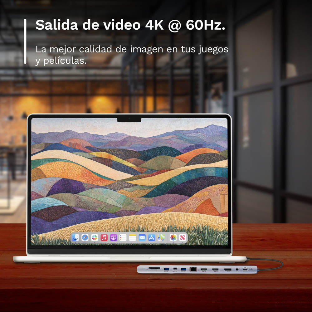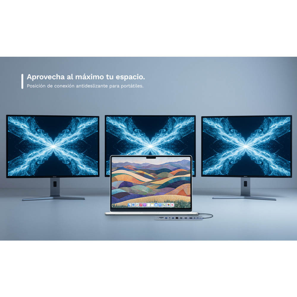 POSICIÓN INDISTINTA DE CONEXIONADO AL LAPTOP. PUEDE CONECTAR SU DOCKING STATION AL PC INDISTINTAMENTE DE DONDE TENGA ESTE EL PUERTO TYPE-CDISPONE DE UN PUERTO DE CARGA RÁPIDA PD DE 100W, 2 X 4K@60HZ HDMI Y 1 X 4K@60HZ DP, ETHERNET GIGABIT, 3X USB 3.2 GEN1, Y 1 X USB C PARA TRANSFERENCIA DE DATOS, LECTOR DE TARJETAS SD/MICRO SD Y TOMA PARA MICRÓFONO/AUDIO DE 3,5 MMCONECTA HASTA 3 MONITORES A TU LAPTOP U ORDENADOR PERSONAL.ESTE HUB TYPE-C DISPONE DE 2 PUERTOS HDMI Y 1 PUERTO DP. TODOS ELLOS ADMITEN SALIDA 4K@60HZ, LO QUE PERMITE DAR LA MEJOR RESOLUCIÓN DE SU ORDENADORESTE DOCKING STATION TYPE-C, LE HARÁ EXPERIMENTAR LA MEJOR CALIDAD DE IMAGEN EN SUS JUEGOS Y PELÍCULAS. GRACIAS A SU RESOLUCIÓN DE HASTA 4K@60HZACOLCHADO DE SILICONA ANTIDESLIZANTE EN SUS DOS CARAS