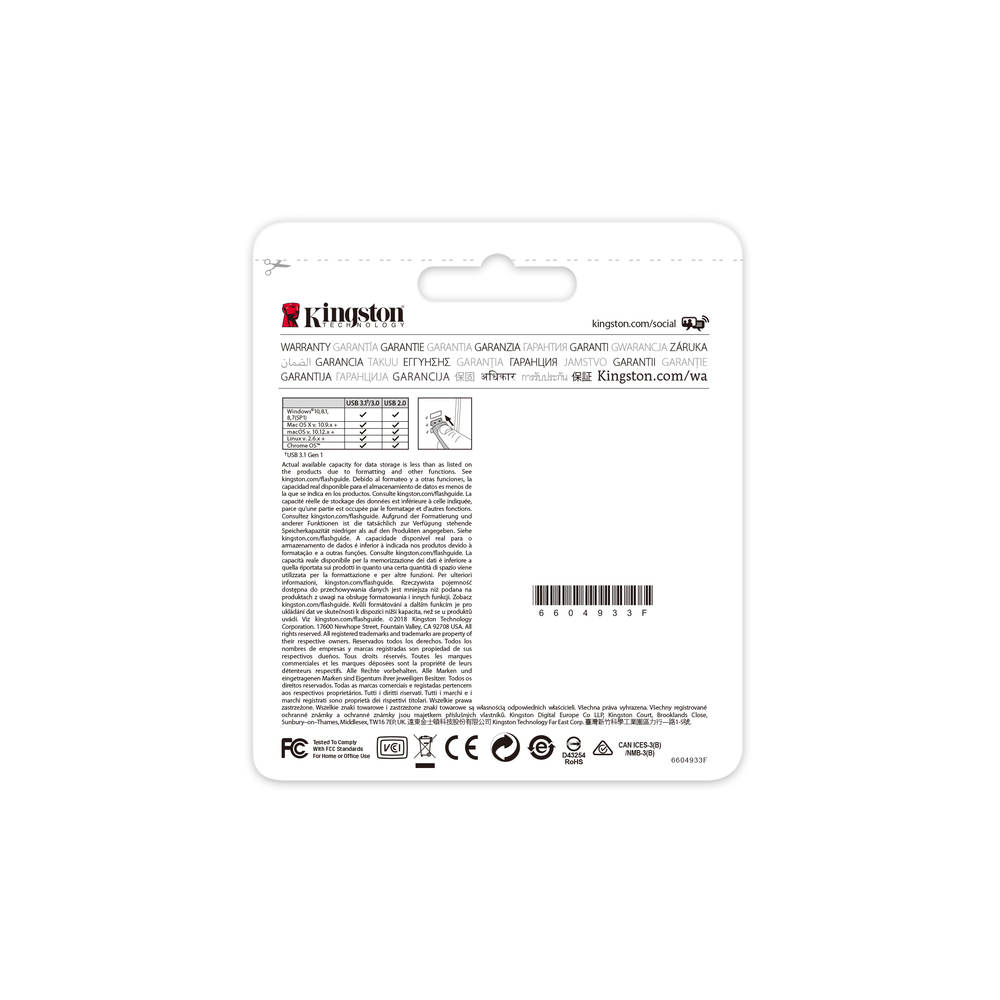 ** Algunas de las capacidades mencionadas en los dispositivos de almacenamiento Flash se utilizan para formatear y otras funciones, por lo tanto no se encuentran disponibles para el almacenamiento de datos. Por este motivo, la capacidad real de almacenamiento de datos es inferior a la indicada en los productos. Consulte información más detallada en la Guía de memoria Flash de Kingston, en kingston.com/flashguide.