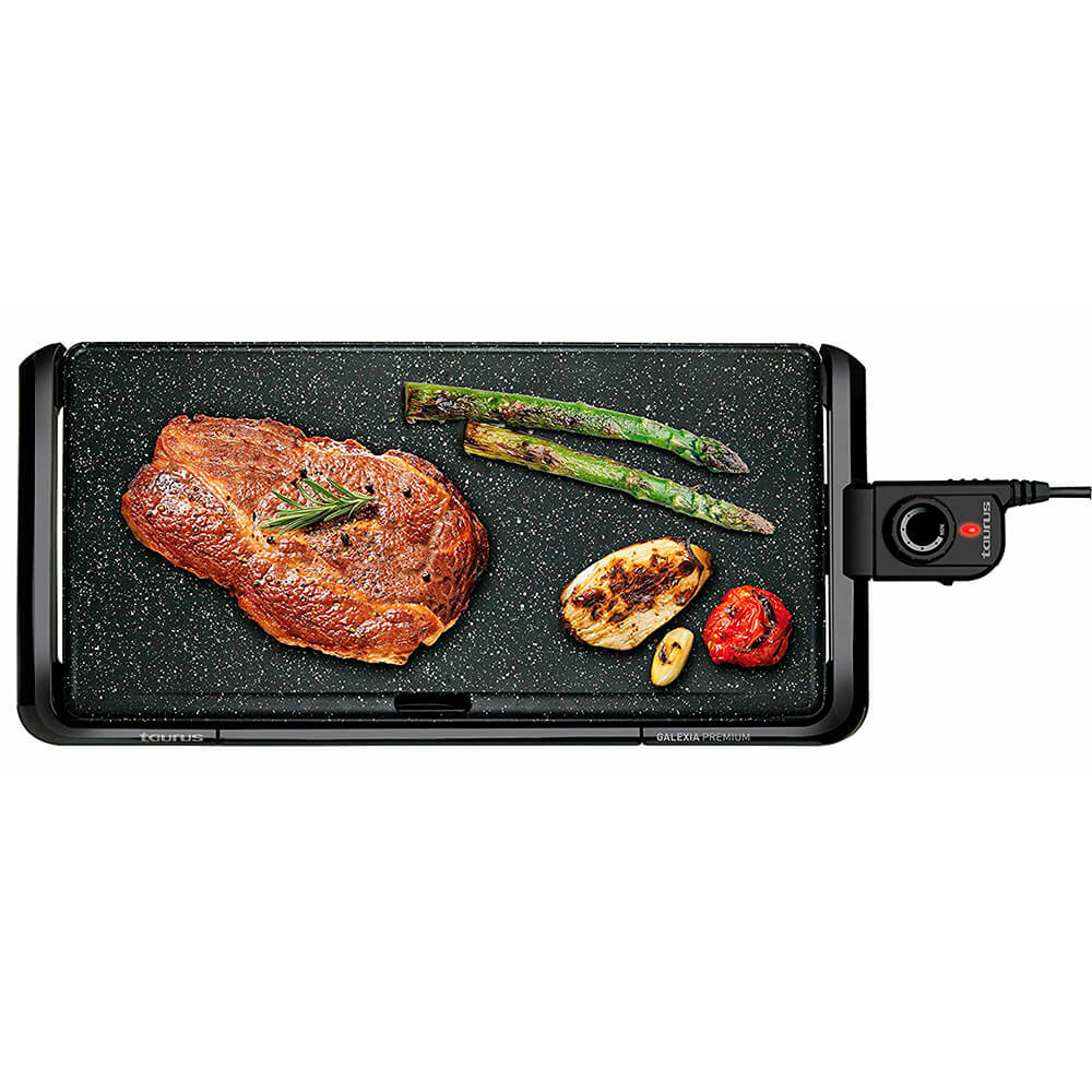 Superficie de cocción: 51x 22,5 cm. Placa antiadherente con acabado stone de fácil limpieza. Control de temperatura. Bandeja recoge grasas.Gracias a su recubrimiento en piedra, Taurus ha conseguido que la temperatura se mantenga uniforme por más tiempo, para que puedas preparar todo tipo de alimentos, de forma única. Carnes sabrosas, verduras crujientes y pescados bien ahumados, en resumen, una auténtica barbacoa en casa. Además, y como te comento un poco más abajo su placa libre de PFOA permite la cocina más sana.Sin necesidad de aceite, la preparación de todo tipo de alimentos es inmejorable, ya que además los restos de grasa desprendida van a parar a la bandeja inferior. Cocina sana y natural.Su termostato ajustable permite la selección de potencia de forma rápida e intuitiva, de forma que no tengas reparos en ponerte manos a la obra.
