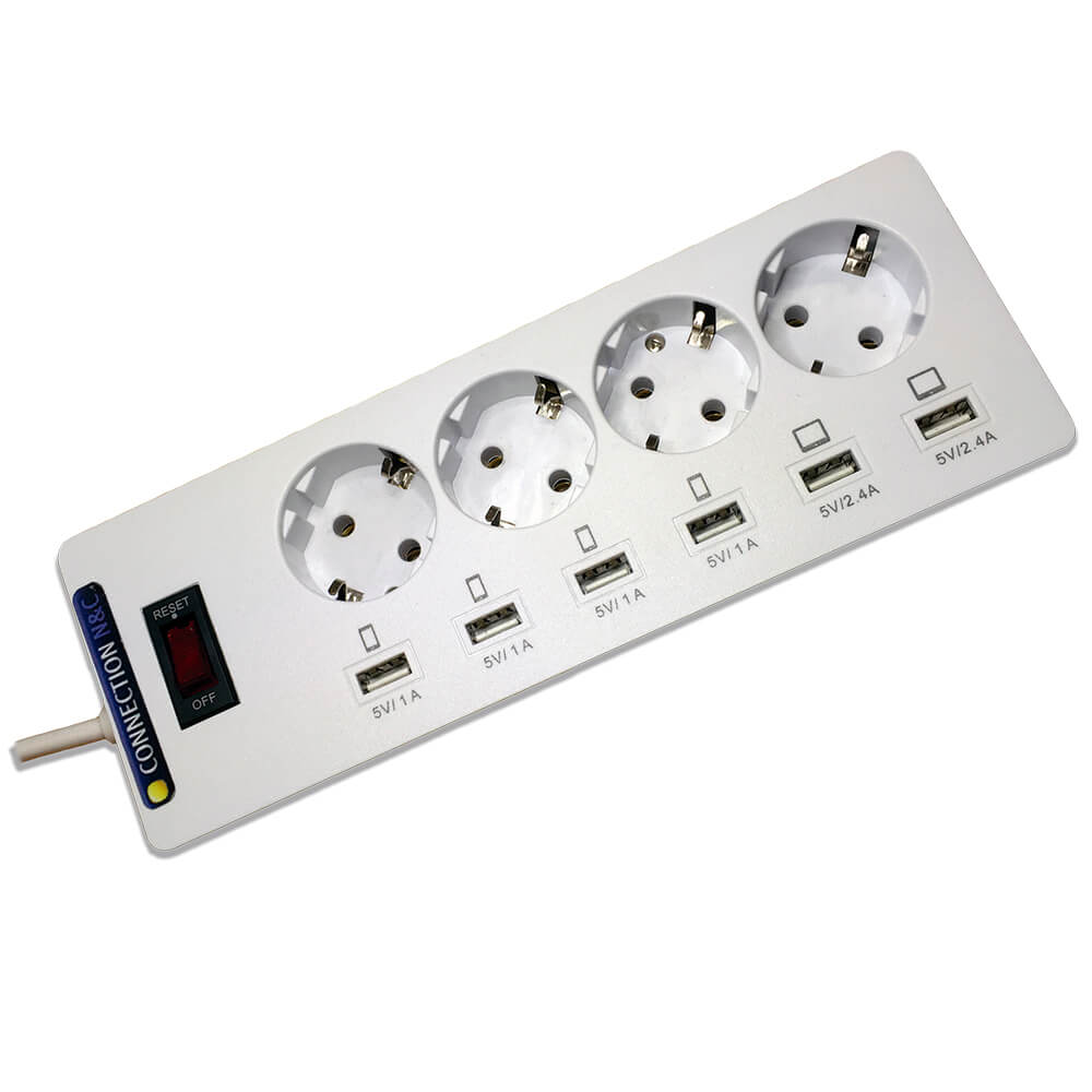 Regleta 4 tomas y cargador de 6 puertos USB, para disponer de un mismo lugar de carga para todos nuestros dispositivos.