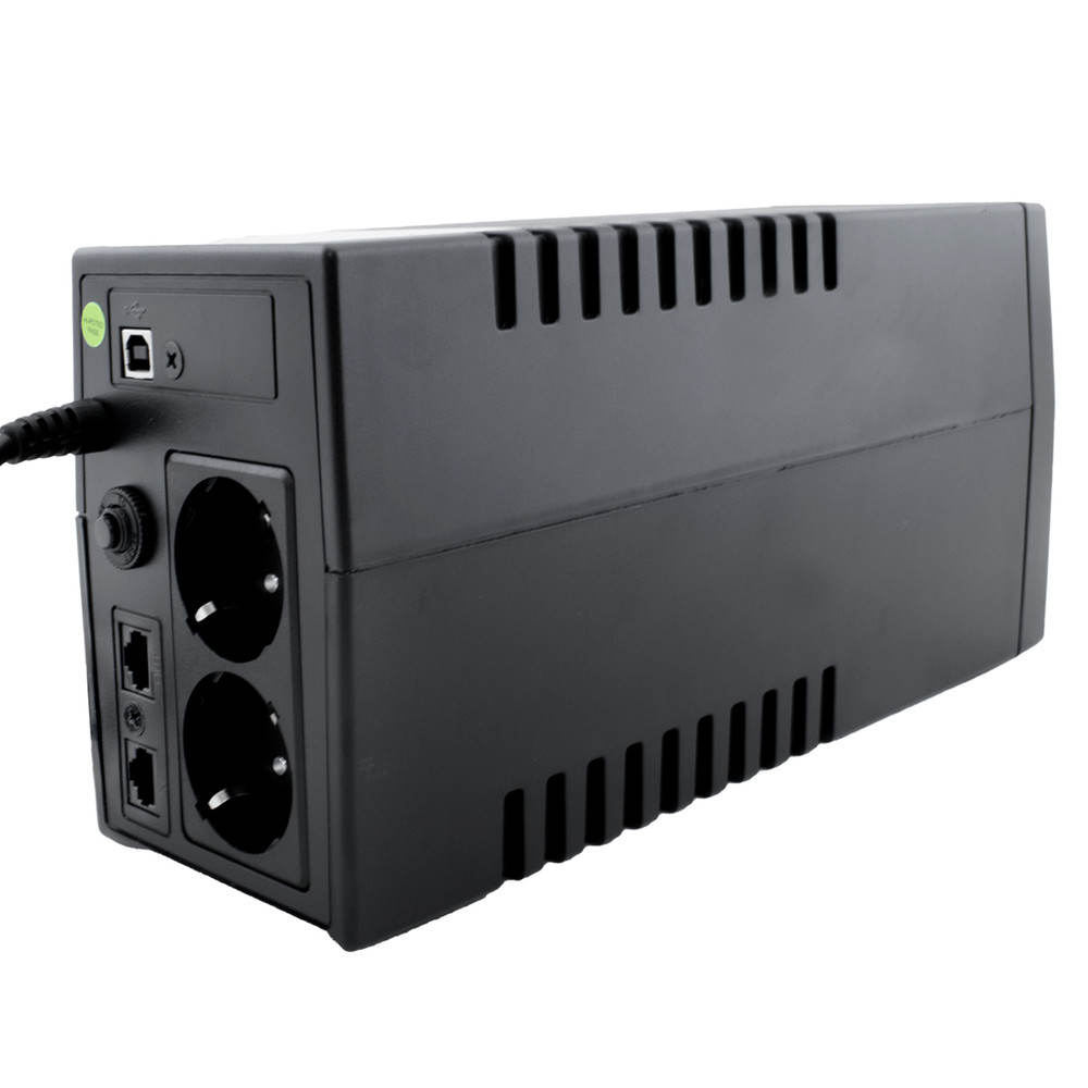 ENTRADAVoltaje: 220/230/240 VACRango de voltaje: 162290 VACRango de frecuencia: 50/60Hz (110%) con autodetecciónSALIDARegulación (modo batería): +/- 10%Rango de frecuencia (modo batería): 60Hz o 50Hz +/- 1HzTiempo de transferencia: 2 6 ms (típico)Forma de onda (modo batería): onda sinusoidal simuladaBATERÍATipo y número: 12V / 9 Ah x 1Tiempo de recarga típico: entre 6 y 8 horas para recargar 90%PANTALLA LCDIndicadores: Modo AC, Modo Batería, Nivel de carga de la batería, Capacidad de la batería, voltaje de entrada y salida, sobrecarga, fallo y batería bajaALARMAModo batería: sonido cada 10 segundosBatería baja: sonido cada segundoSobrecarga: sonido cada 0.5 segundosReemplazo de batería: sonido cada 2 segundosFallo: sonido continuoCONECTORESTomas Schuko: 2 enchufes reespaldados por bateríaPuertos USB: 1 para conexión con PCOtros puertos: 2 puertos RJ-45 para filtrado de señal en instalaciones de redOTROSProtecciones: picos de tensión, descarga y sobrecargaDimensiones: 353 x 149 x 162 mm (aprox)Peso: 7,8 kgSonoridad: menos de 45dB