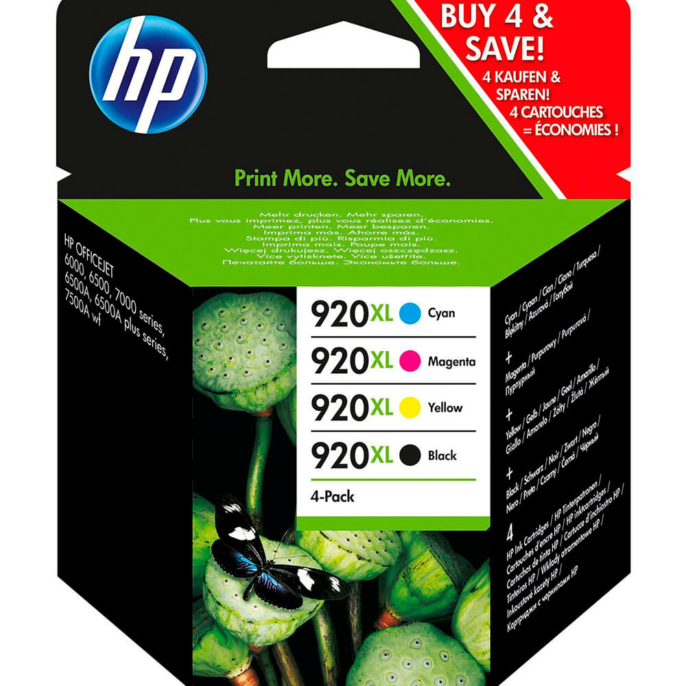 Los paquetes combinados HP 920XL de cartuchos de tinta Black/Cyan/Magenta/Yellow Officejet imprimen documentos profesionales a color con un coste inferior al láser. Los cartuchos de alta capacidad ofrecen un valor excepcional para una impresión frecuente.Imprima documentos profesionales en color por hasta un 40% menos por página que con láser, con tintas HP Officejet1. Obtenga hasta dos veces y media más páginas en negro, utilizando un cartucho de gran capacidad2.